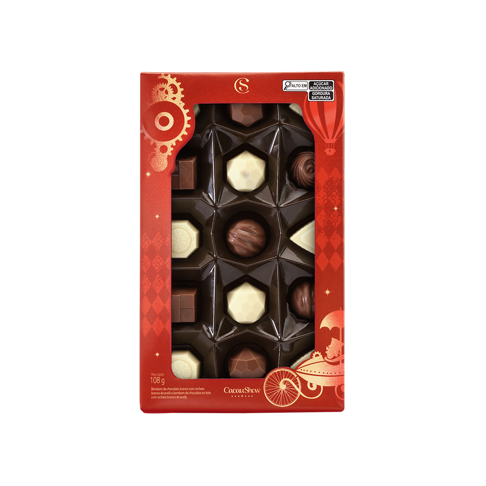 Uma seleção de bombons feitos com o delicioso chocolate ao leite e branco da Cacau Show, com um recheio de avelã que derrete na boca, proporcionando uma experiência de prazer única e inigualável.