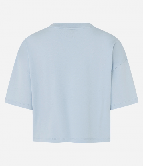 Camiseta feminina de modelo boxy, confeccionada em malha premium de algodão peruano, com gola redonda e mangas curtas amplas.