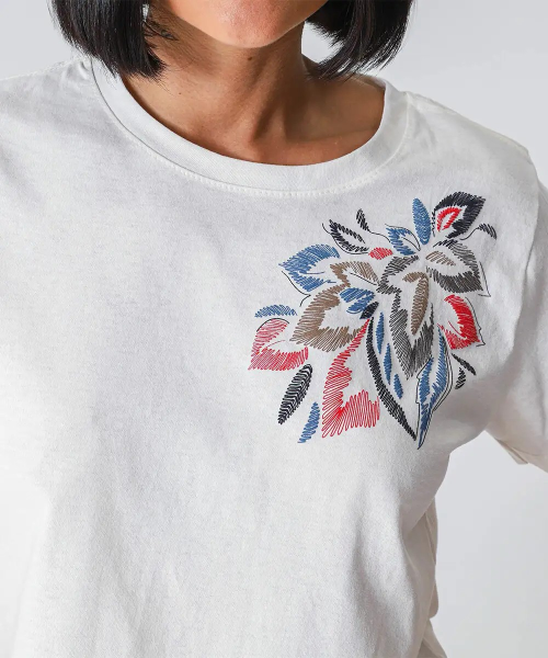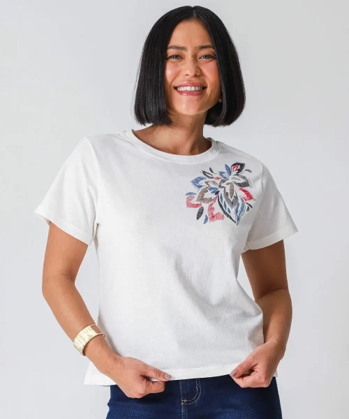 Blusa Feminina Estampa Flor Marisa Off White Blusa feminina, confeccionada em malha algodão. Possui decote redondo, estampa flor, manga curta, acabamento e costura no tom.