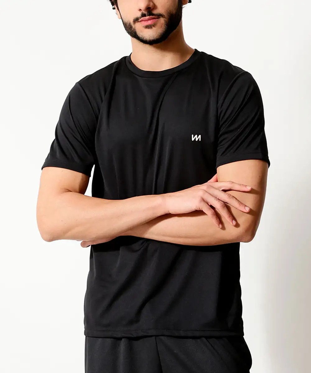 Camiseta masculina fitness, confeccionada em malha poliéster. Possui gola redonda, manga curta, acabamento em costura no tom.