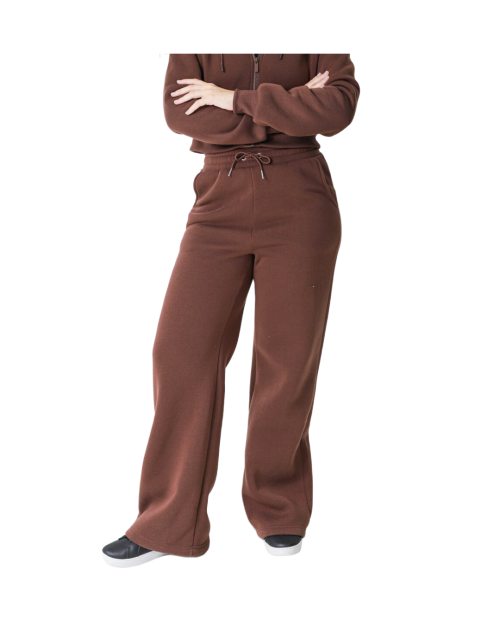 Calça feminina, modelo wide leg, confeccionada em tecido moletom flanelado. Possui cós com elástico, bolsos frontais, acabamento e costura em tom contrastante.