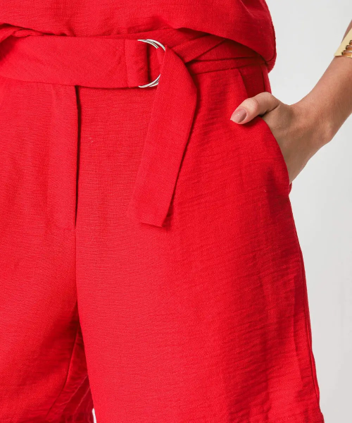 Short feminino modelo alfaiataria, confeccionado em tecido plano poliéster. Possui bolsos frontais, cinto com fivela, textura, acabamento e costura no tom.