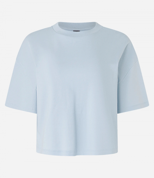 Camiseta feminina de modelo boxy, confeccionada em malha premium de algodão peruano, com gola redonda e mangas curtas amplas.