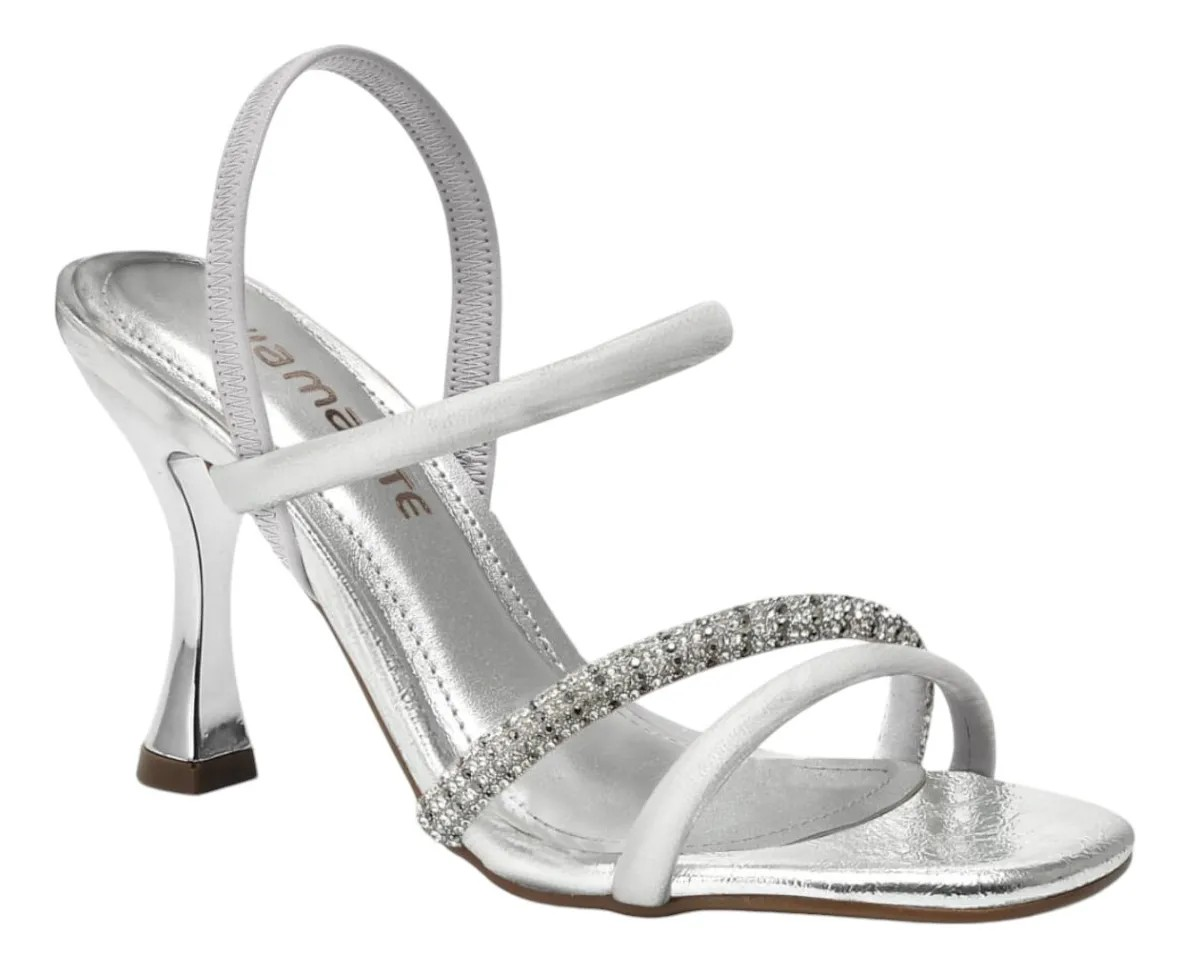 A sandália possui o cabedal com tiras que alternam entre couro sintético e pedrarias com muito brilho e strass.
