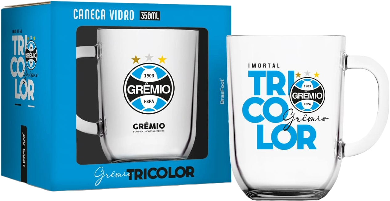 Caneca oficial do Grêmio feita em vidro resistente, perfeita para torcedores apaixonados pelo Imortal Tricolor. Ideal para uso diário ou para colecionadores, acompanha embalagem personalizada do clube.
