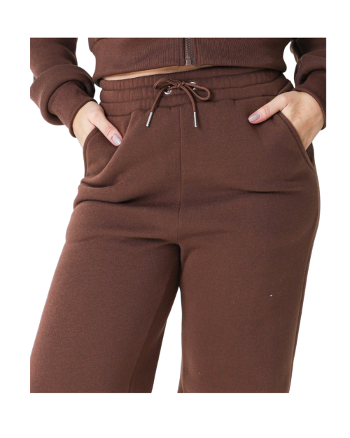Calça feminina, modelo wide leg, confeccionada em tecido moletom flanelado. Possui cós com elástico, bolsos frontais, acabamento e costura em tom contrastante.